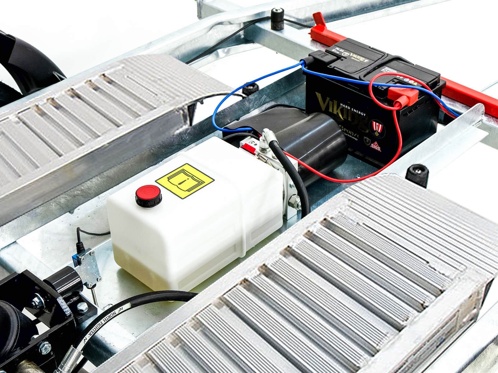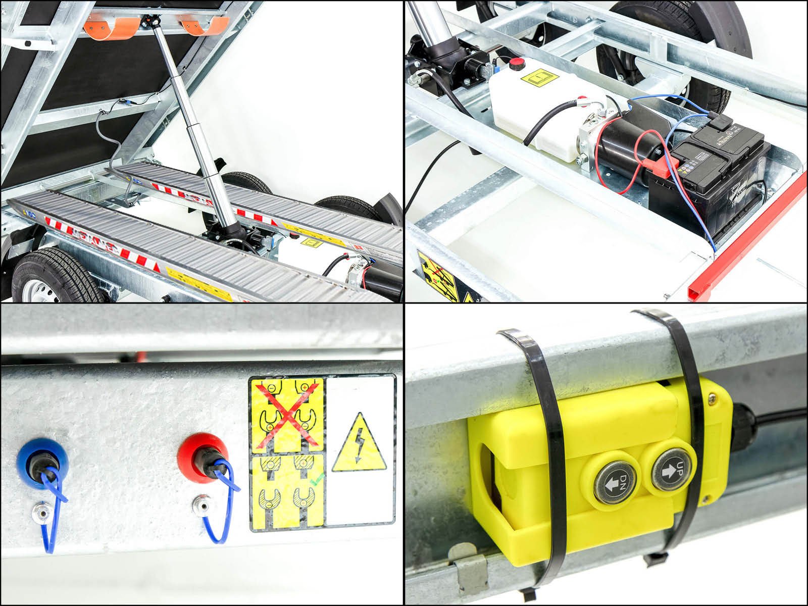 Een veelzijdige driezijdige kipper met oprijplaten, elektro-hydraulische pomp en telescopische steunpoten, geschikt voor bouw-, tuin- of transportwerkzaamheden.