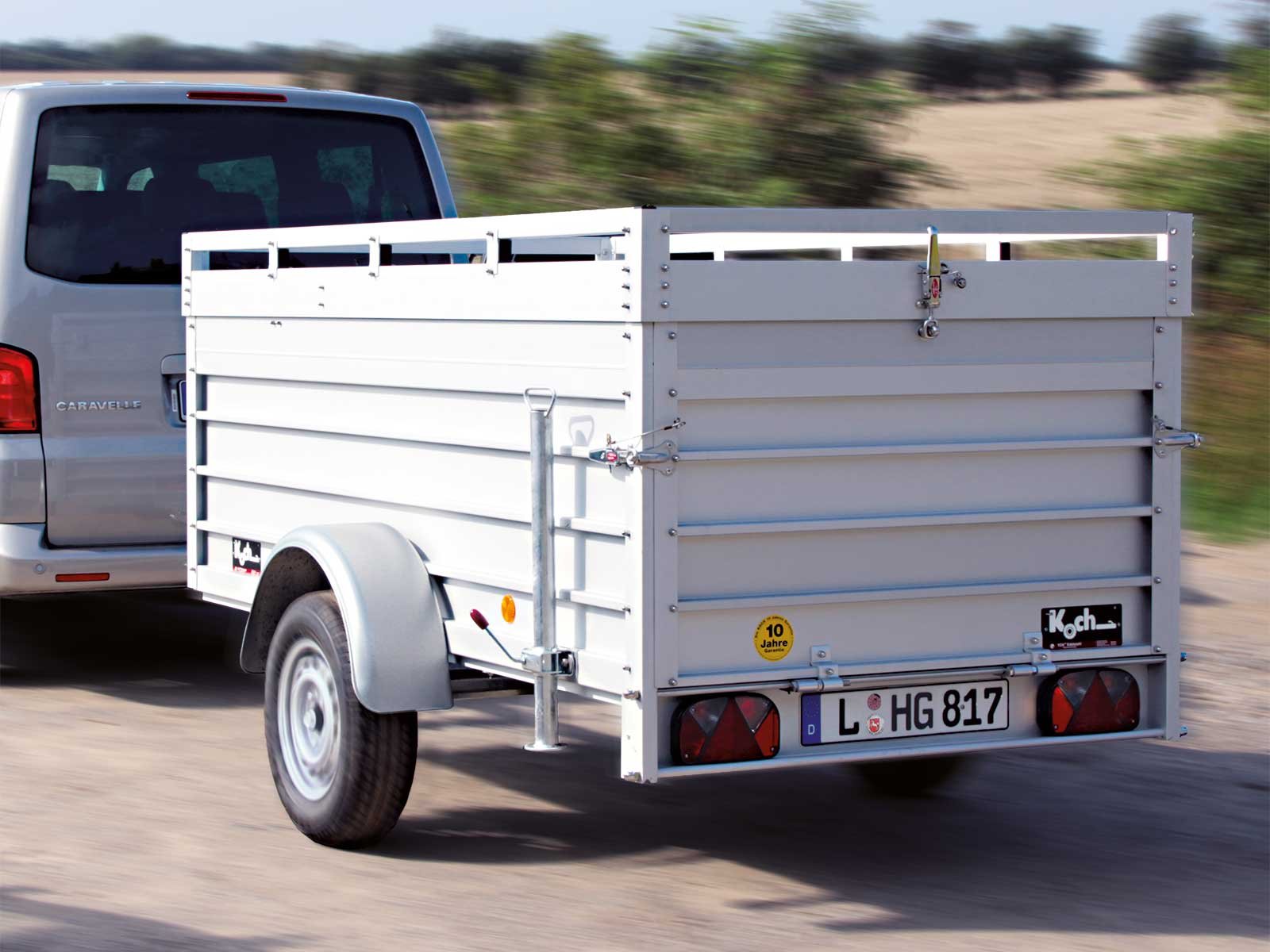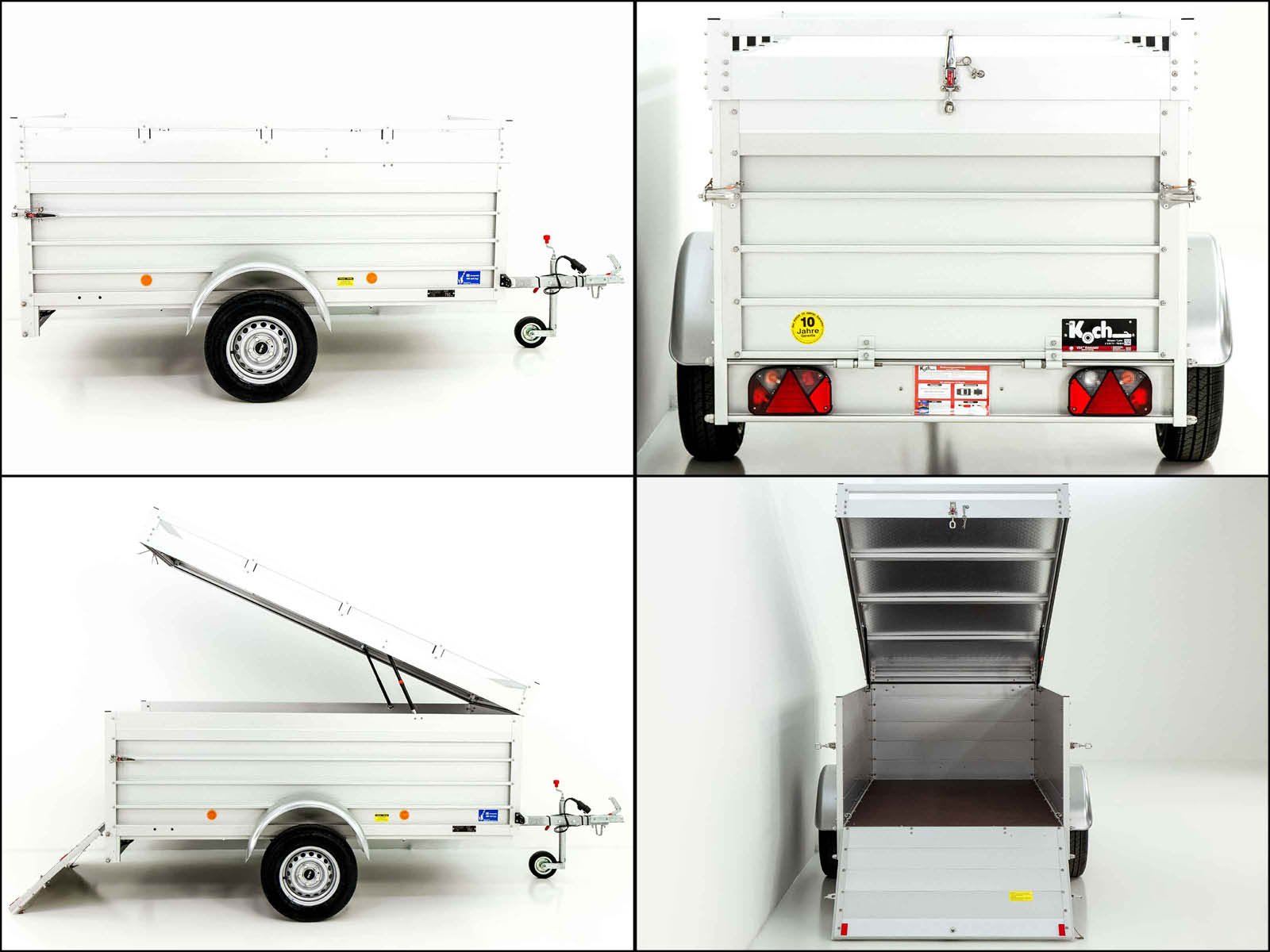 De Koch-aanhanger type B1000 met deksel en een laadruimte van 105 x 205 x 50 cm is een lichte aluminium aanhanger met een toegestaan totaalgewicht van 1000 kg en een laadvermogen van 840 kg. Deze aanhanger wordt al meer dan 30 jaar in Duitsland geproduceerd en wordt geleverd met 10 jaar garantie.