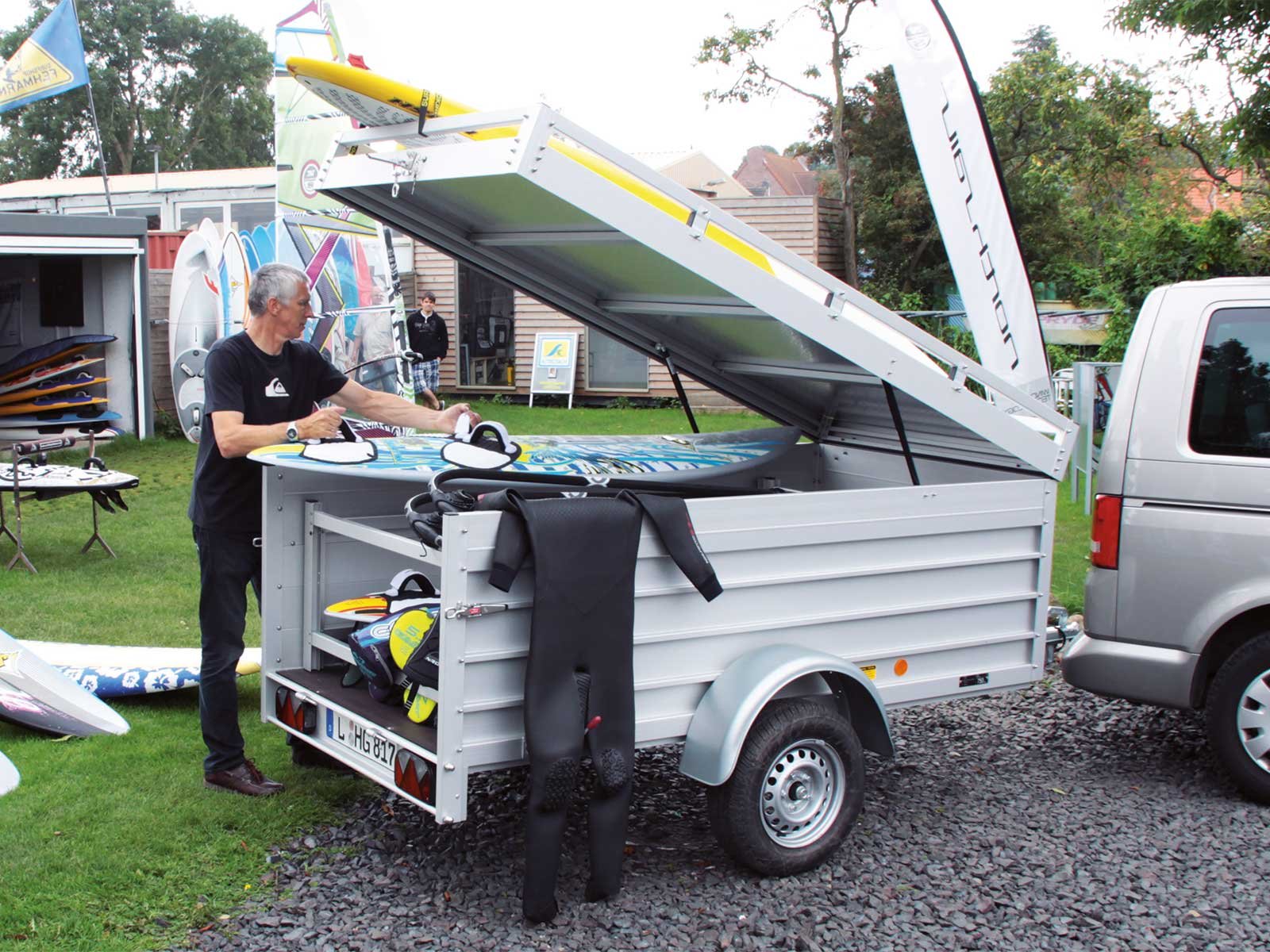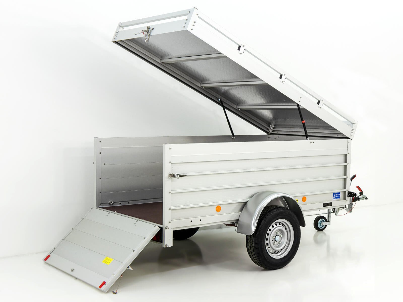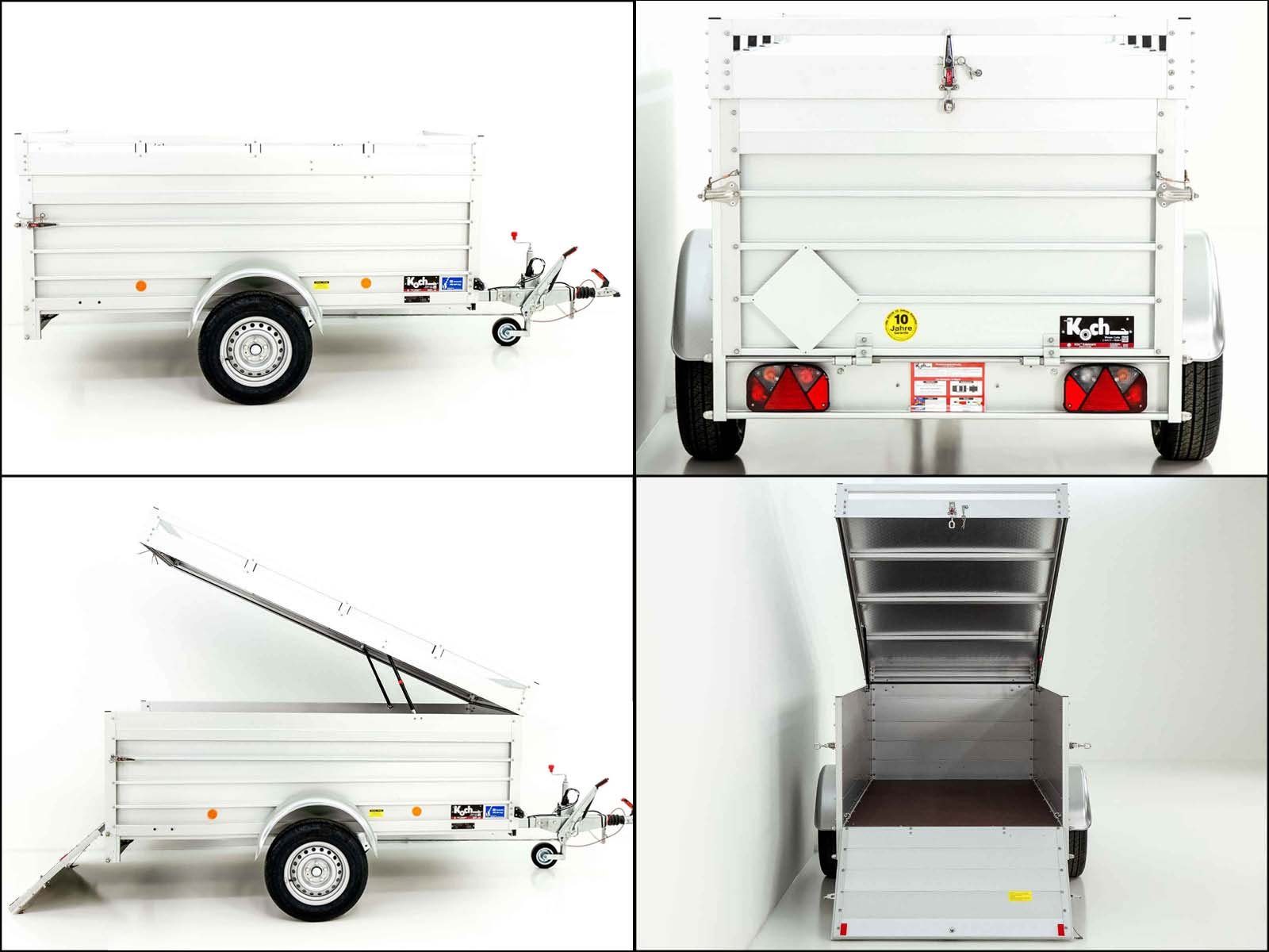 De Koch-aanhanger met deksel, type 4.13 (125 x 250 x 80 cm), biedt een laadvermogen van 1.060 kg en een toegestaan totaalgewicht van 1.300 kg. Deze aanhanger is volledig van aluminium gemaakt, wordt in Duitsland geproduceerd en geleverd met 10 jaar garantie.