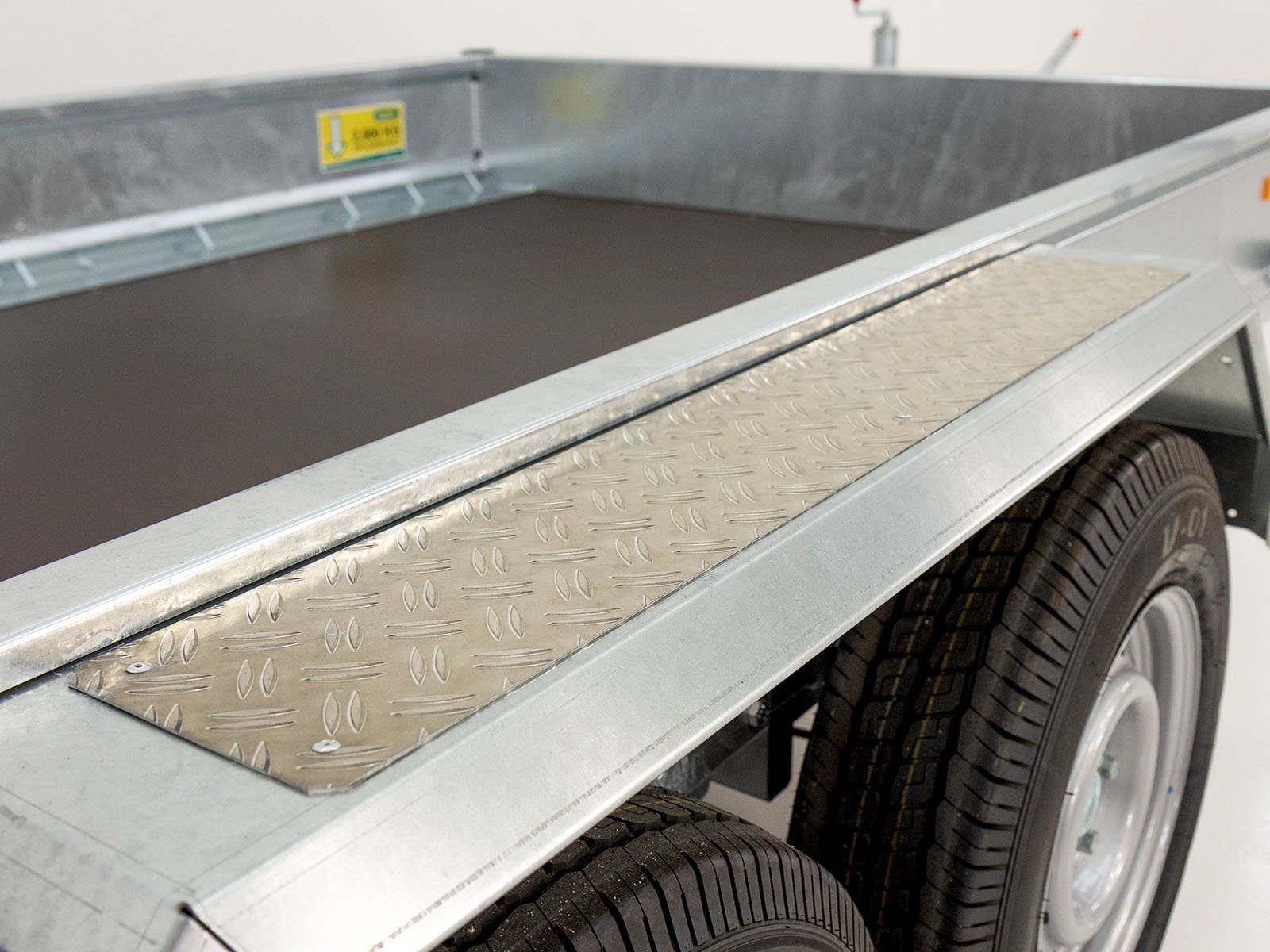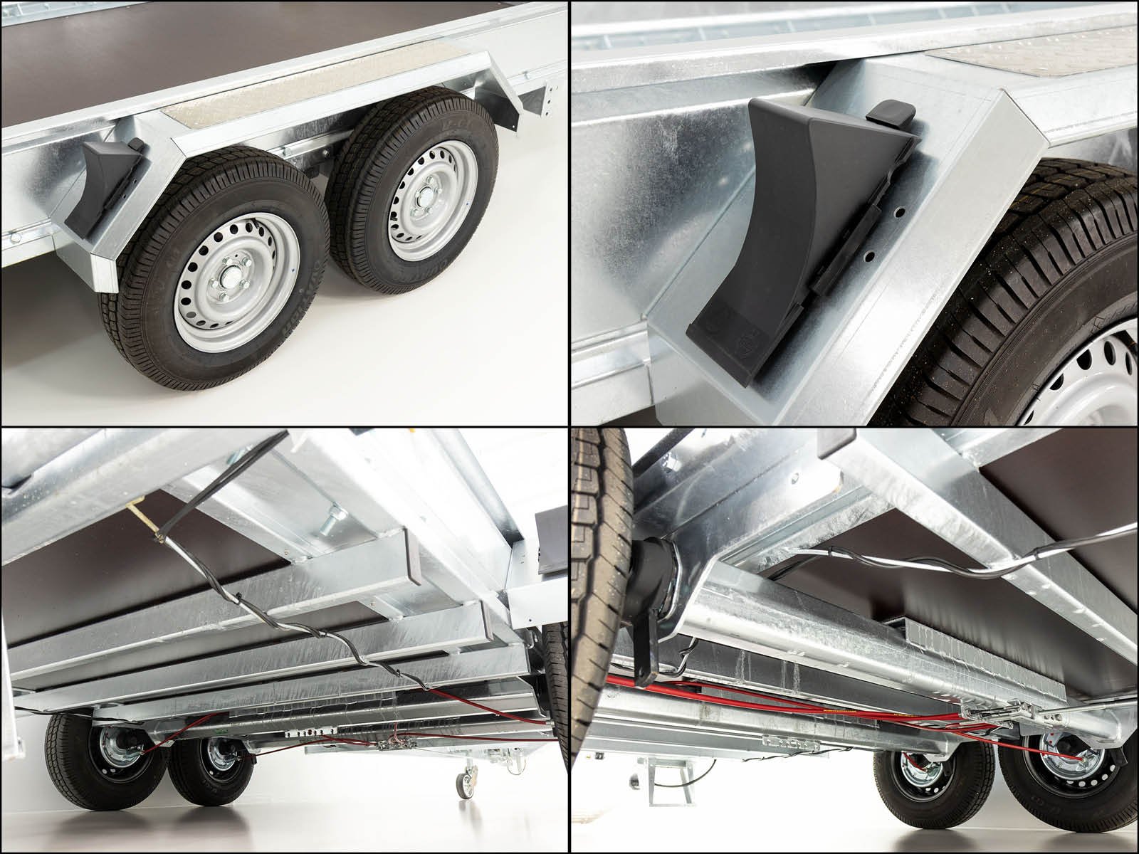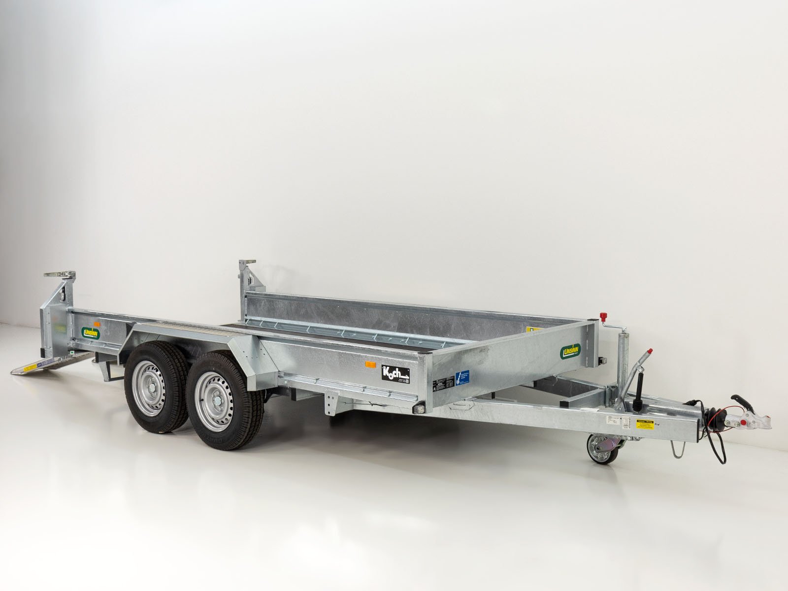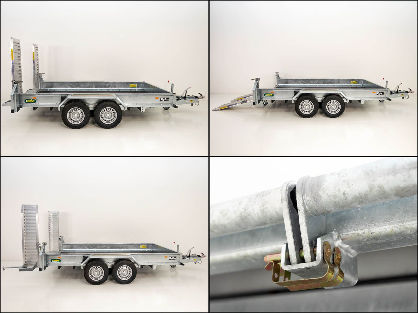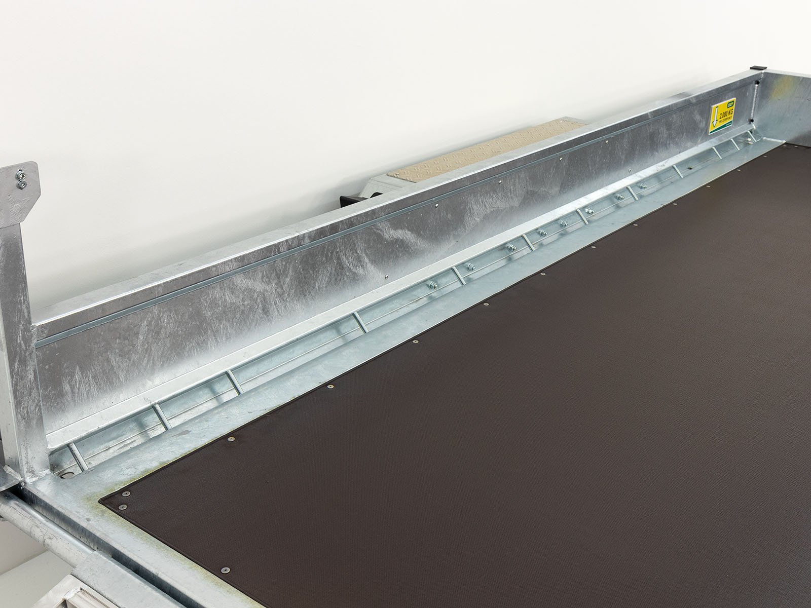 | Speciale kenmerken | Gelast ruimtelijk buisframe, volledig volbad verzinkt; oprijplaten verschuifbaar en draaibaar met veerondersteuning; 10 paar sjorogen met 2.000 kg draagvermogen per oog; stabiele en beloopbare spatborden met aluminium tranenplaat |