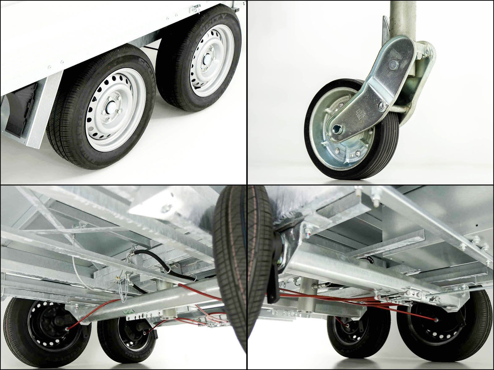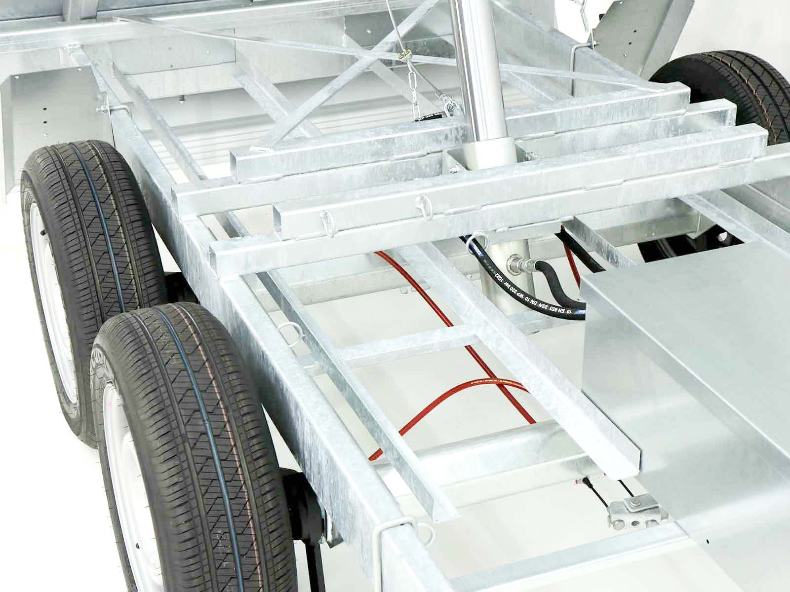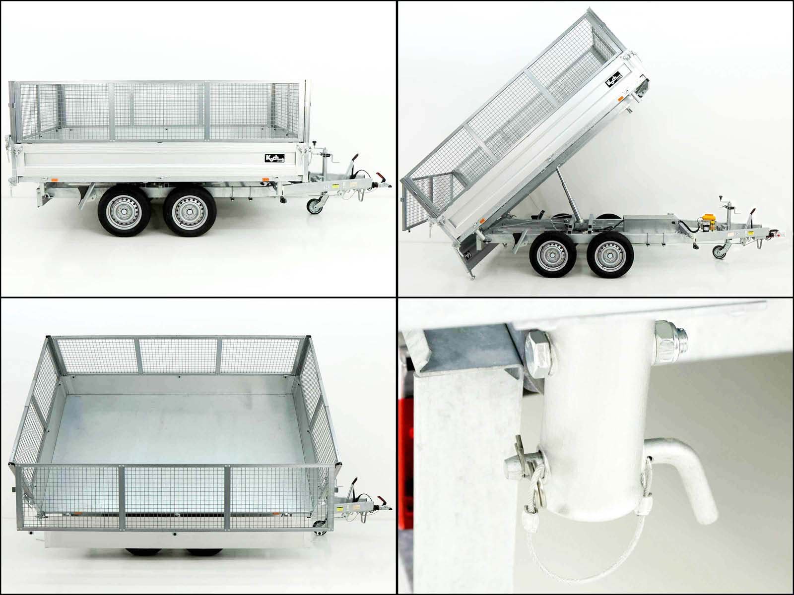 Deze praktische driezijdige kipper overtuigt met een gaasopzet van 65 cm hoog, een elektrische hydraulische pomp en een noodpomp die met een accuschroevendraaier kan worden bediend. Ideaal voor bulkgoederen en transportwerkzaamheden waarbij zijdelingse bevestiging vereist is.