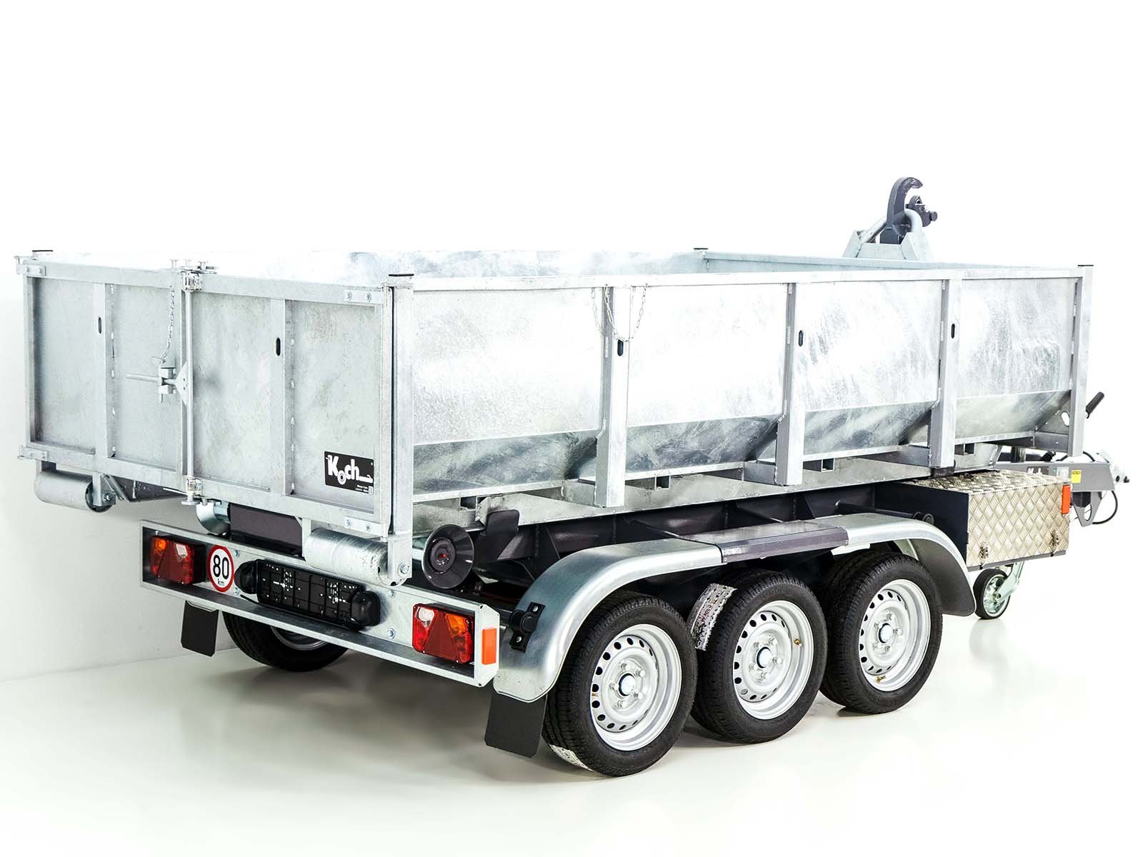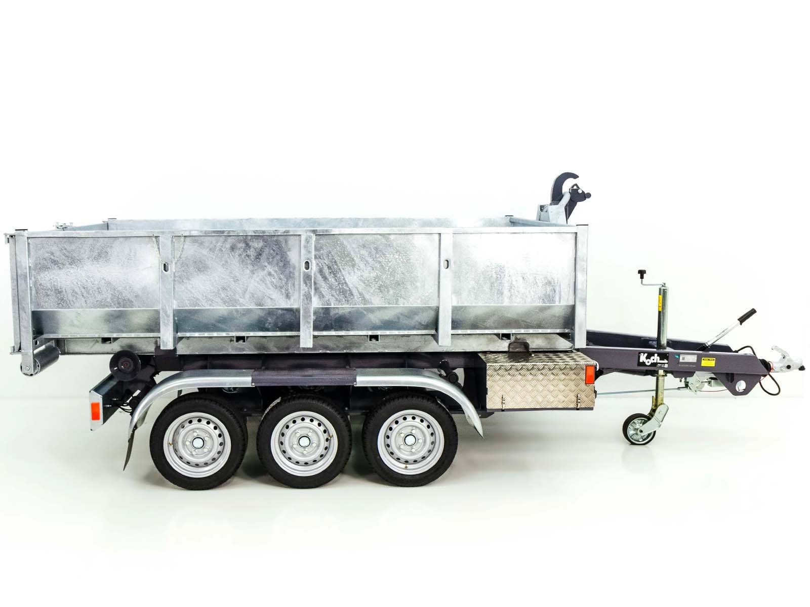 De Vezeko KONOS 35-3 3,5t kipper met kiepbak van 57 cm hoog is de perfecte keuze voor professioneel transport van bulkgoederen en afval. Uitgerust met een krachtig haaksysteem en een elektrische hydraulische pomp, zorgt dit systeem voor efficiënt lossen via draadloze afstandsbediening.